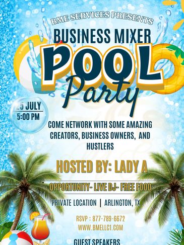 Come network and be entertained at our Pool Party. The event will be located in Dallas, Tx . Direct address will be emailed to customers who purchase tickets. BYOB, FOOD WILL BE PROVIDED, REFRESHMENTS, and ON SITE PHOTOGRAPER